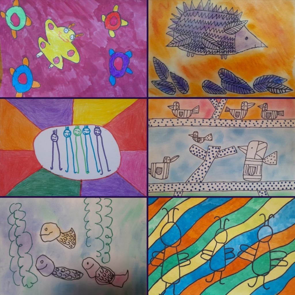 Hat gyönyörű meleg színekkel festett gyerekrajz-szerű képet látunk egy kollázson.